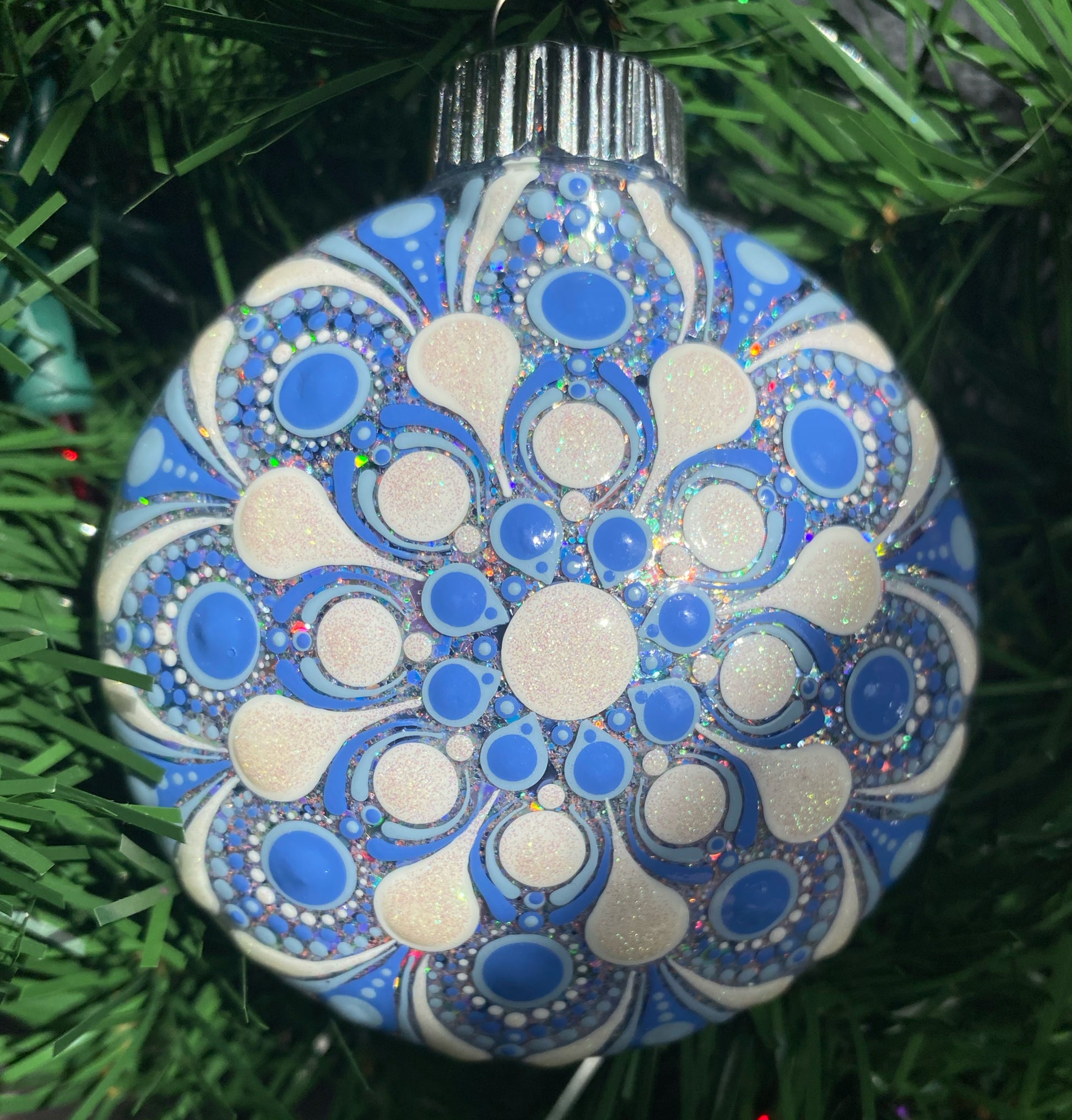 Add a touch of sparkling elegance to your holiday decor with our 3" Glitter Ornament. Made of durable plastic, this ornament features a beautifully hand painted blue & white mandala design, accented with shimmering  glitter.