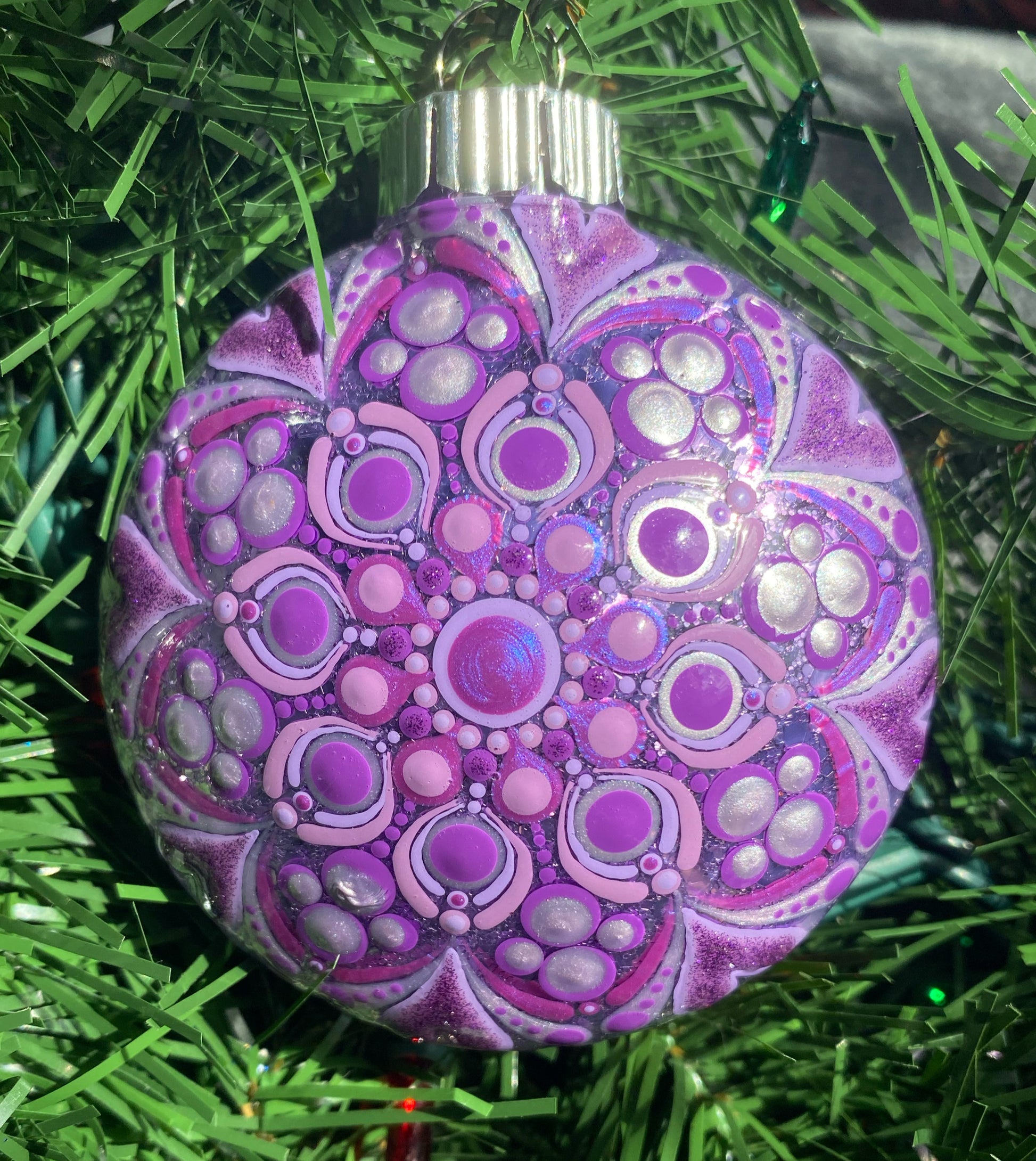 Add a touch of sparkling elegance to your holiday decor with our 3" Glitter Ornament. Made of durable plastic, this ornament features a beautifully hand painted purple mandala design, accented with shimmering purple glitter.