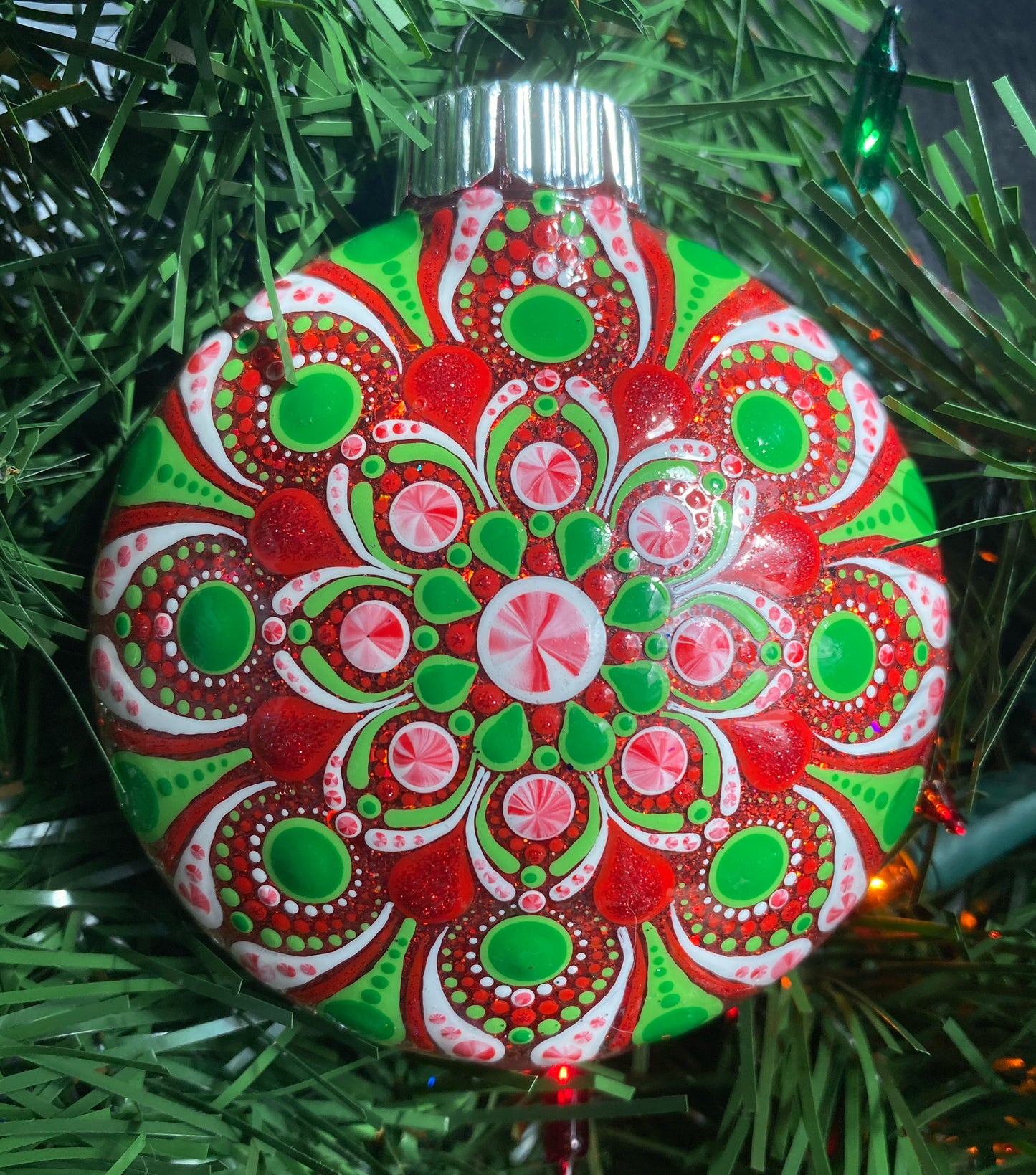 Add a touch of sparkling elegance to your holiday decor with our 3" Glitter Ornament. Made of durable plastic, this ornament features a beautifully hand painted red, green and white peppermint mandala design, accented with shimmering red holographic glitter.