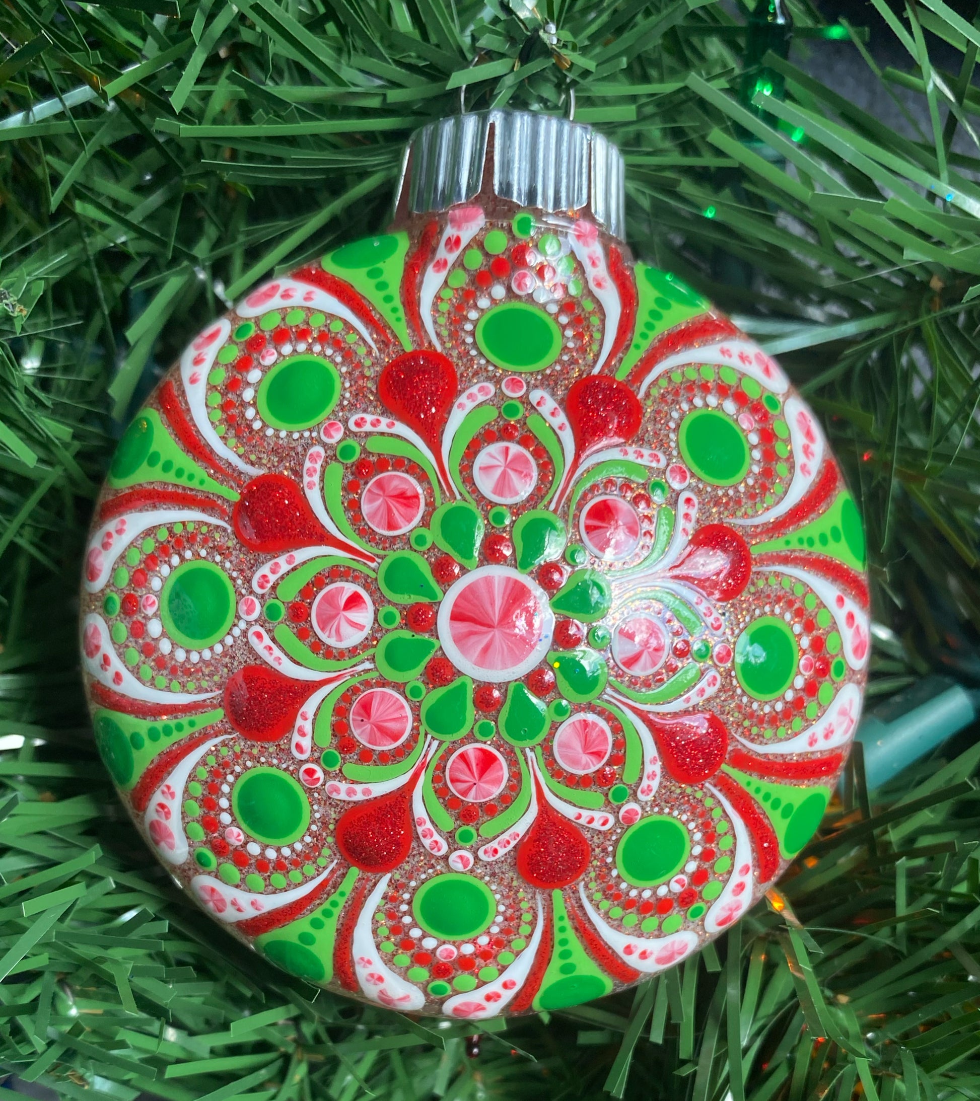 Add a touch of sparkling elegance to your holiday decor with our 3" Glitter Ornament. Made of durable plastic, this ornament features a beautifully hand painted red, green and white peppermint mandala design, accented with shimmering glitter.