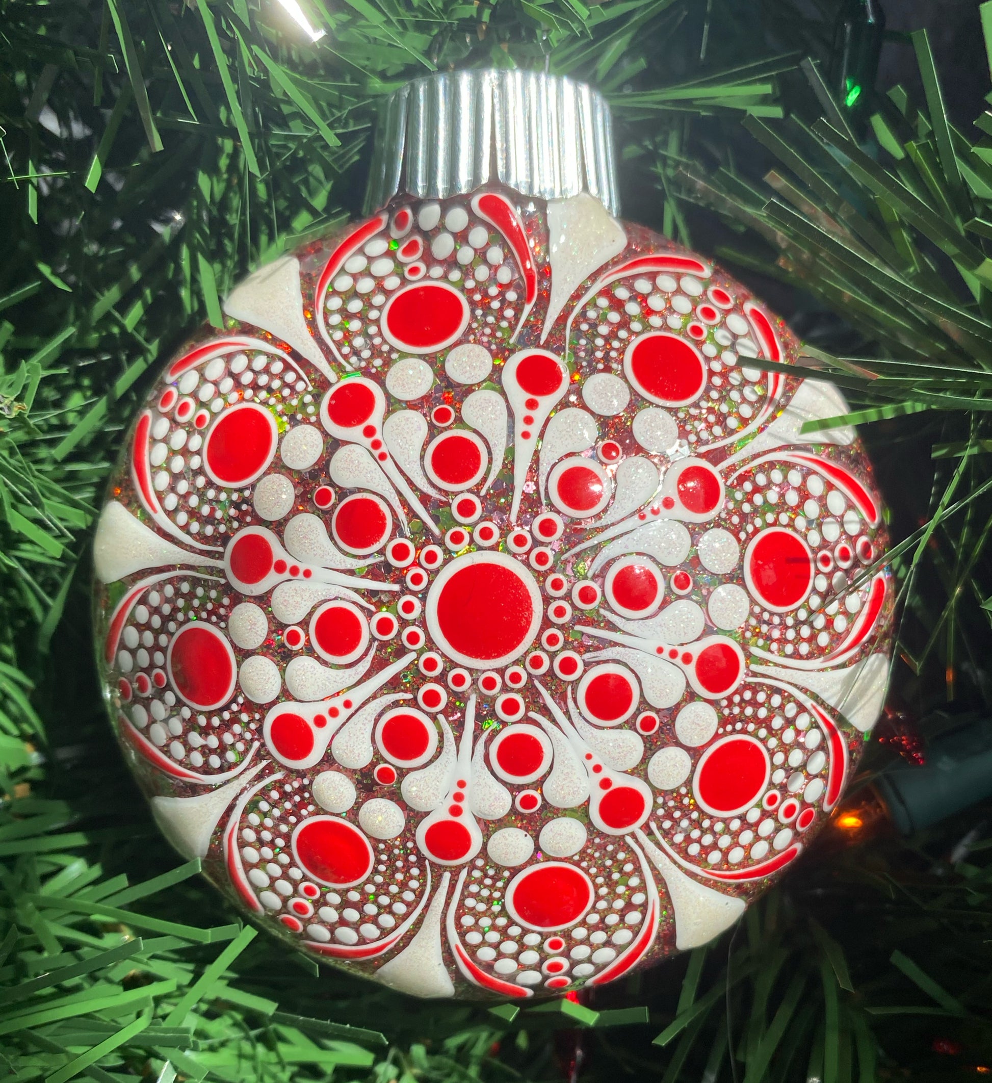 Add a touch of sparkling elegance to your holiday decor with our 3" Glitter Ornament. Made of durable plastic, this ornament features a beautifully hand painted red and white mandala design, accented with shimmering Christmas blend glitter.