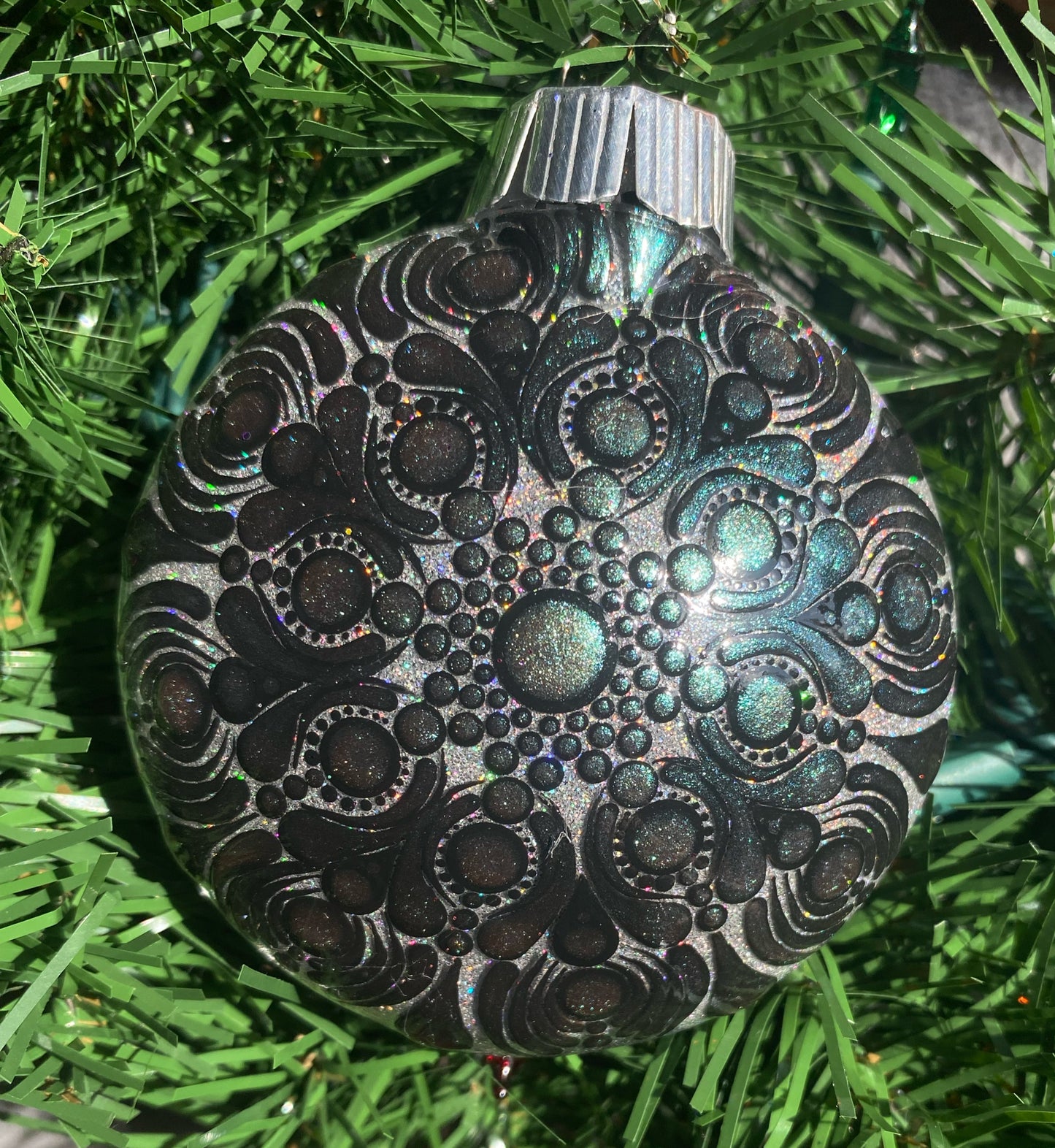 Add a touch of sparkling elegance to your holiday decor with our 3" Glitter Ornament. Made of durable plastic, this ornament features a beautifully hand painted green to blue color shift over black mandala design, accented with shimmering silver holographic glitter.
