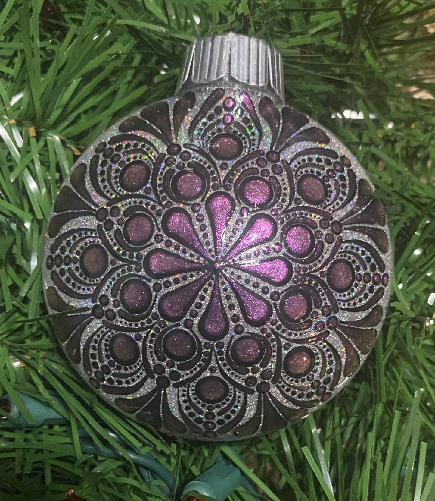 Add a touch of sparkling elegance to your holiday decor with our 3" Glitter Ornament. Made of durable plastic, this ornament features a beautifully hand painted yellow to pink color shift over black mandala design, accented with shimmering silver holographic glitter.