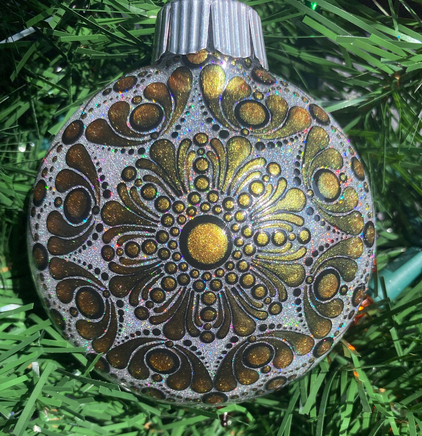 Add a touch of sparkling elegance to your holiday decor with our 3" Glitter Ornament. Made of durable plastic, this ornament features a beautifully hand painted copper to green color shift over black mandala design, accented with shimmering silver holographic glitter.