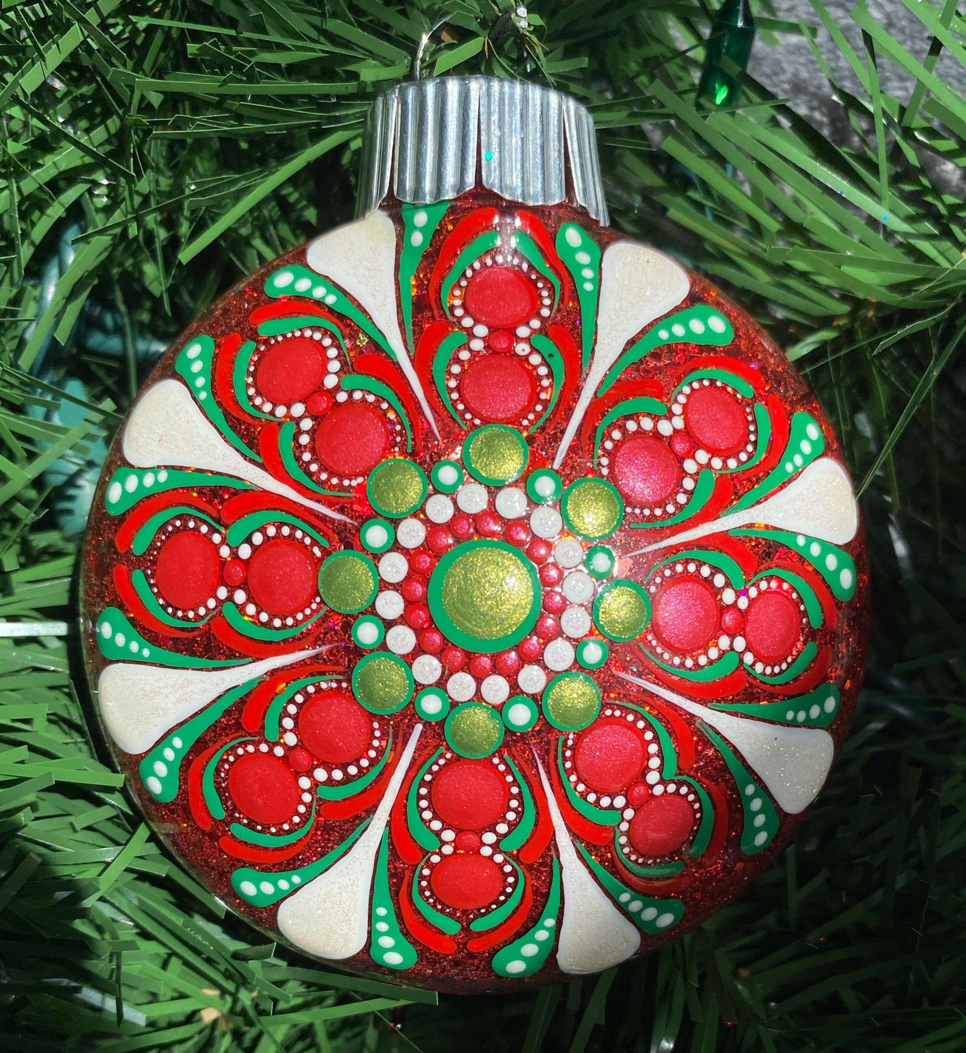 Add a touch of sparkling elegance to your holiday decor with our 3" Glitter Ornament. Made of durable plastic, this ornament features a beautifully hand painted red, green & white mandala design, accented with shimmering red glitter.