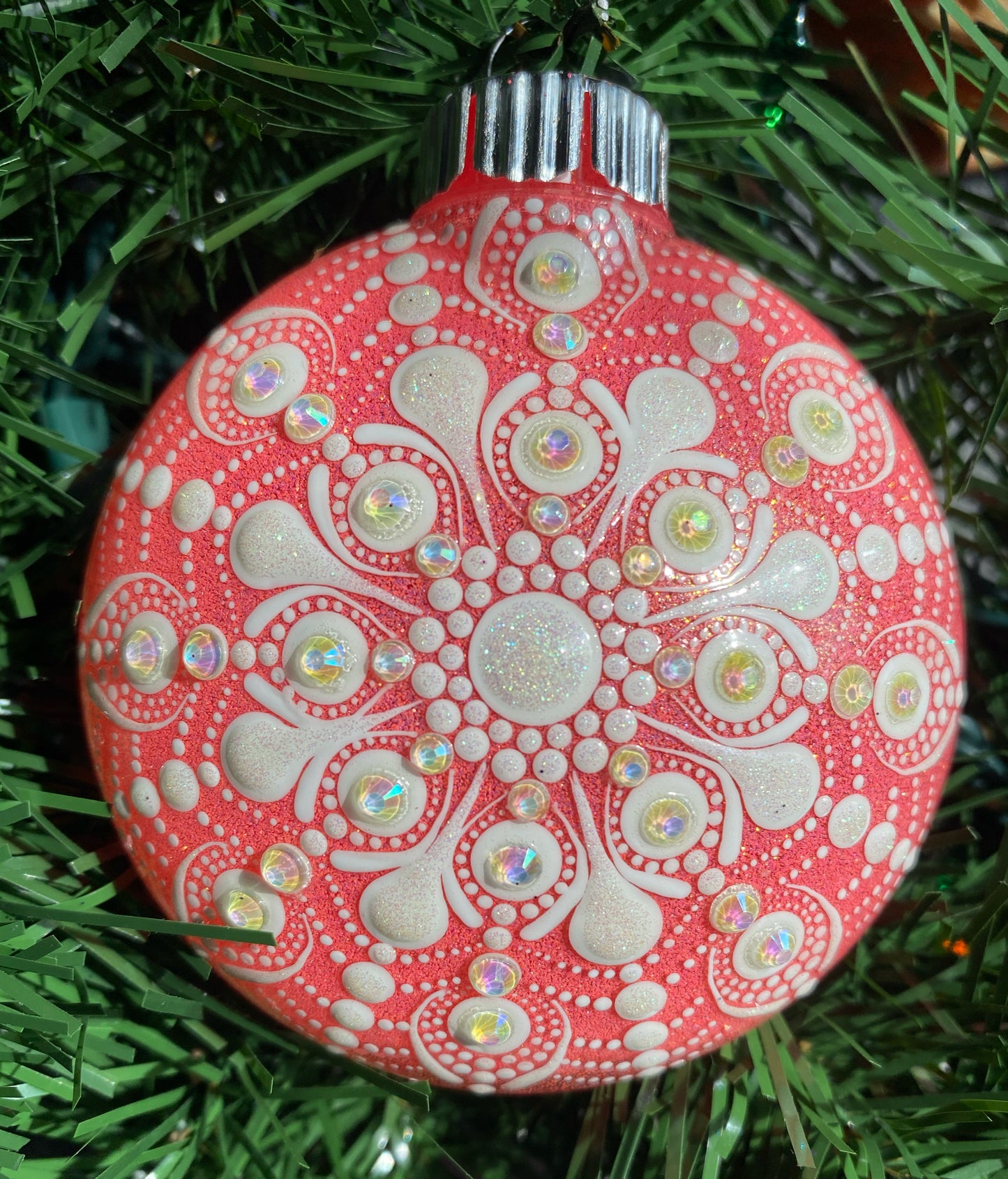 Add a touch of sparkling elegance to your holiday decor with our 3" Glitter Ornament. Made of durable plastic, this ornament features a beautifully hand painted white rhinestone mandala design, accented with shimmering coral glitter.
