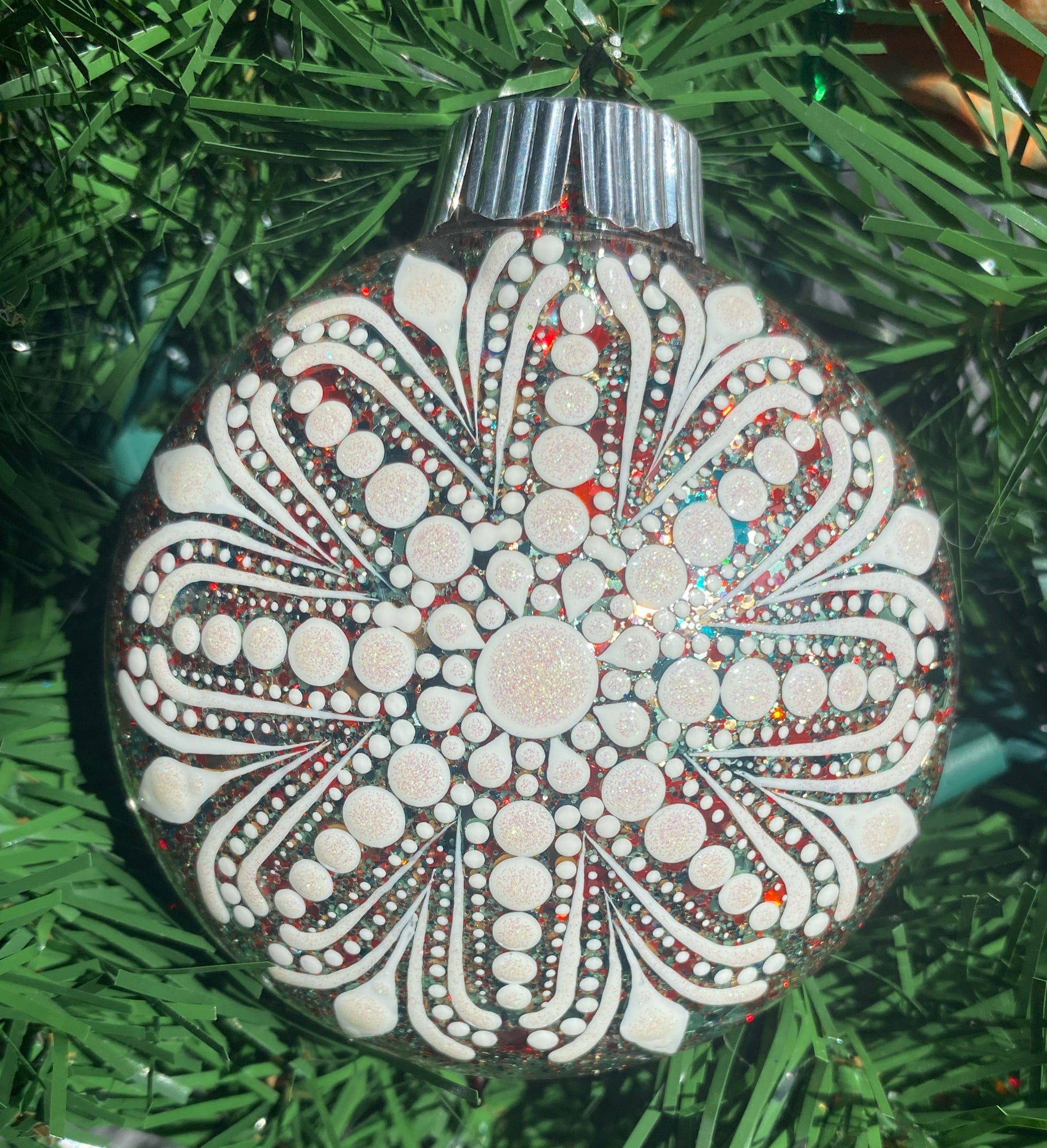 Add a touch of sparkling elegance to your holiday decor with our 3" Glitter Ornament. Made of durable plastic, this ornament features a beautifully hand painted white mandala design, accented with shimmering Christmas blend glitter.