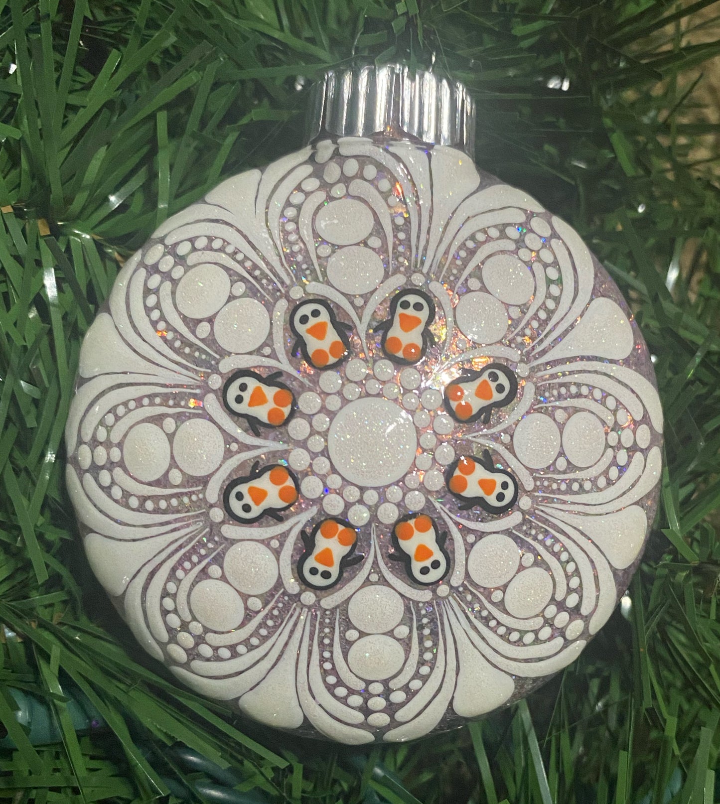 Add a touch of sparkling elegance to your holiday decor with our 3" Glitter Ornament. Made of durable plastic, this ornament features a beautifully hand painted white penguin mandala design, accented with shimmering light pink holographic glitter.
