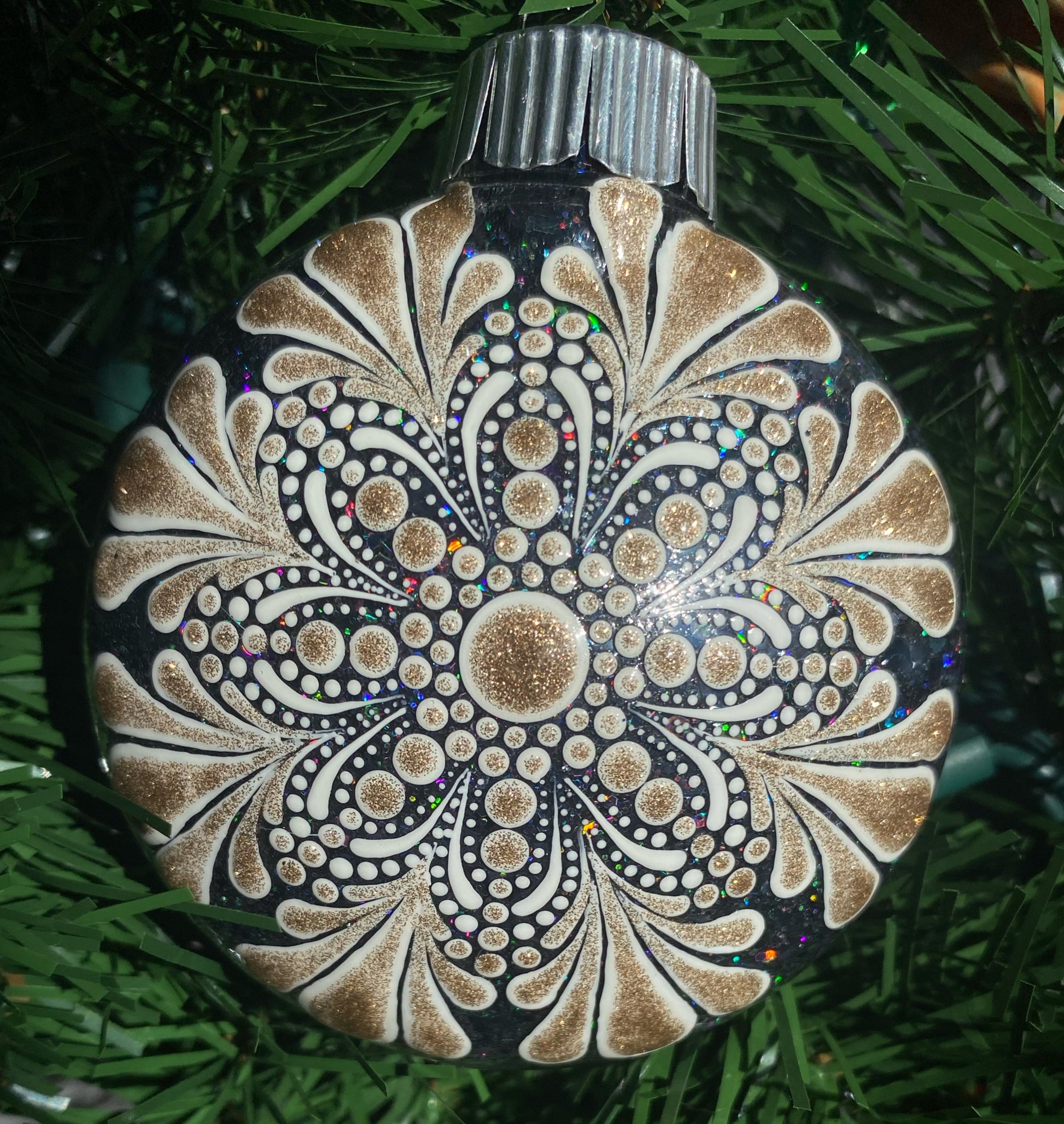 Add a touch of sparkling elegance to your holiday decor with our 3" Glitter Ornament. Made of durable plastic, this ornament features a beautifully hand painted rose gold & white mandala design, accented with shimmering black holographic glitter.