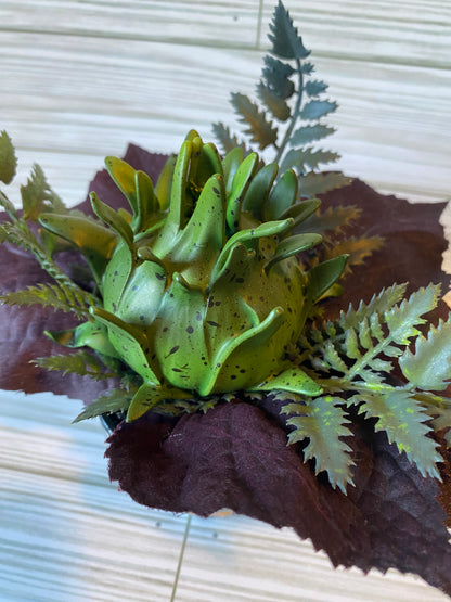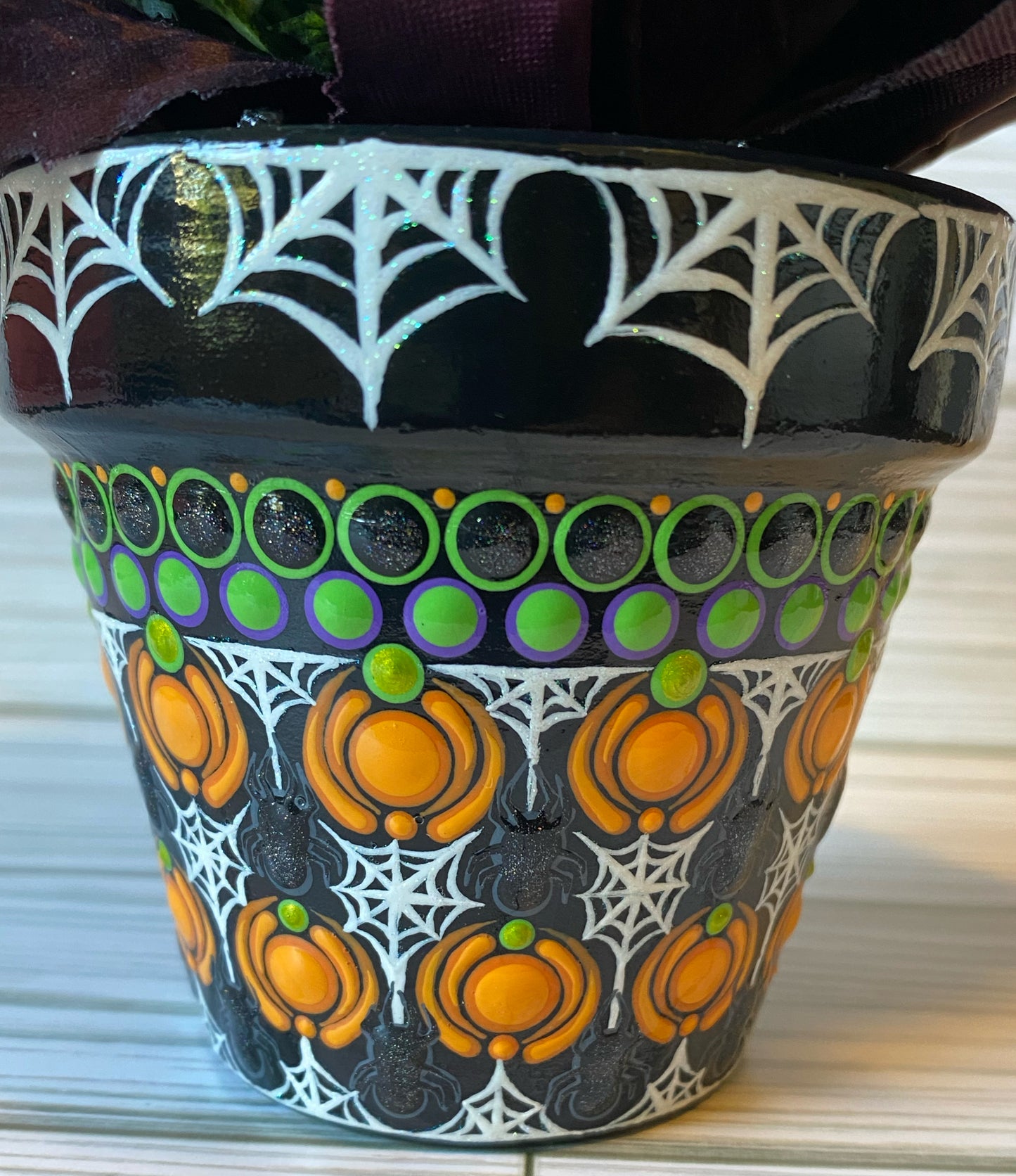 Floral Pots are beautifully hand painted on terra cotta with a Spider, Pumpkin & Spider Web wrap around mandala design. Complete with a faux succulent and fill with resin rocks. These pots are perfect for adding a touch of nature to any spooky space without the hassle of maintenance.